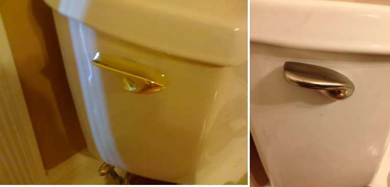 trip lever, this is one of the main functional features in a bathroom. We felt the shiny brass had to go. I chose a satin nickel trip lever from the plumbing aisle, and my husband installed it in less than 15 minutes.